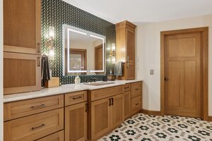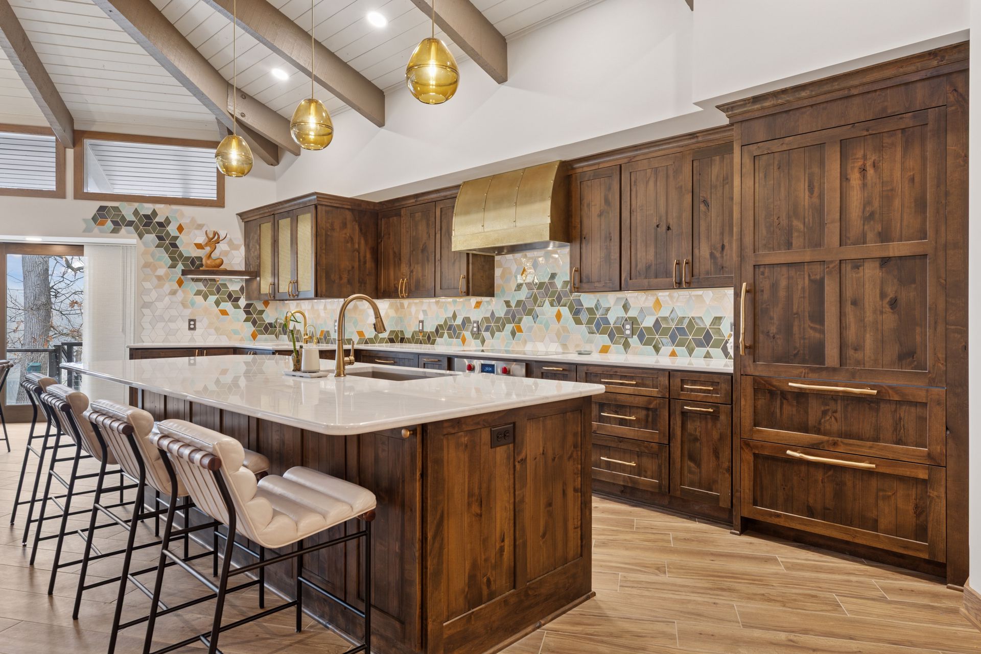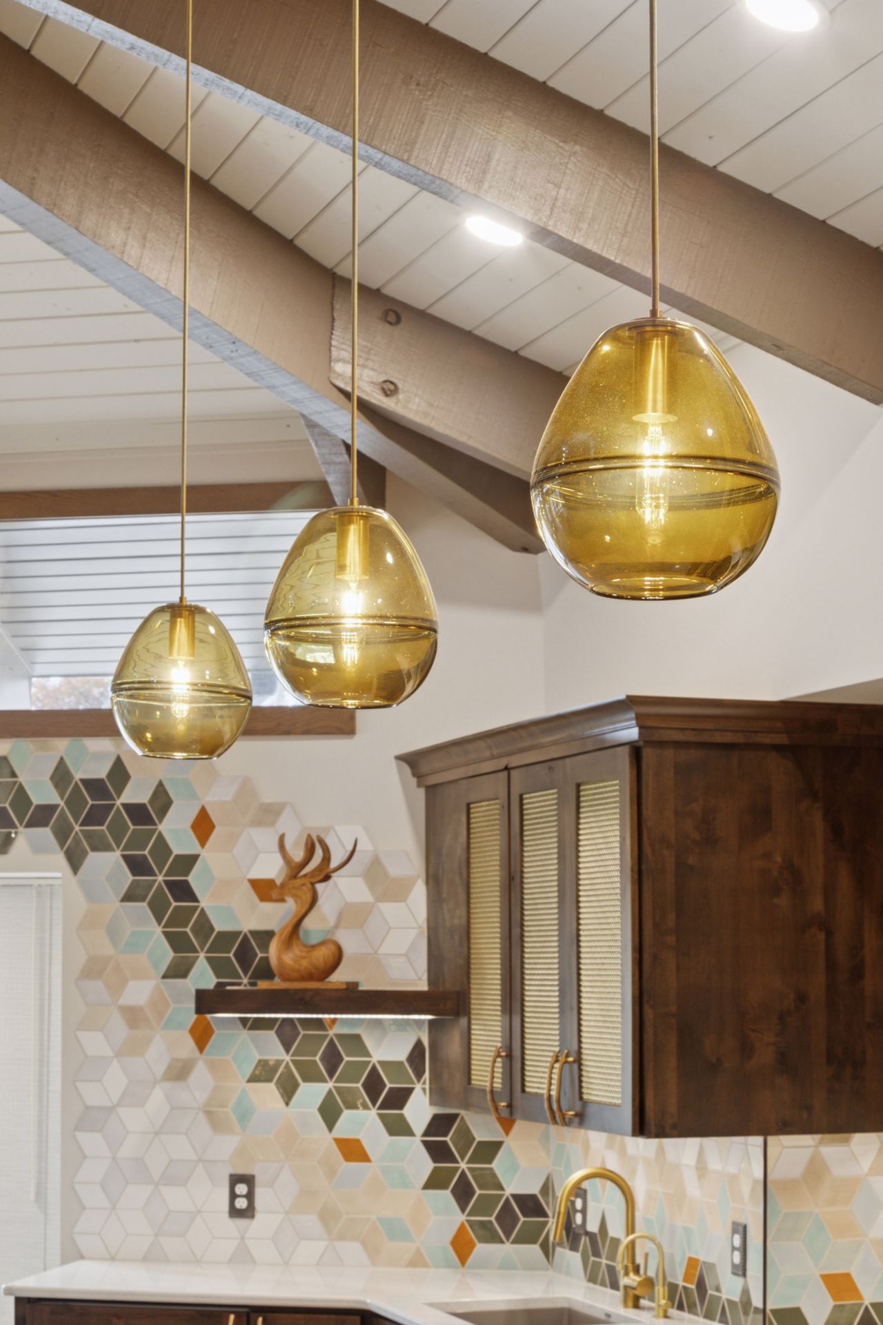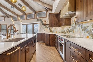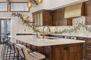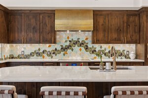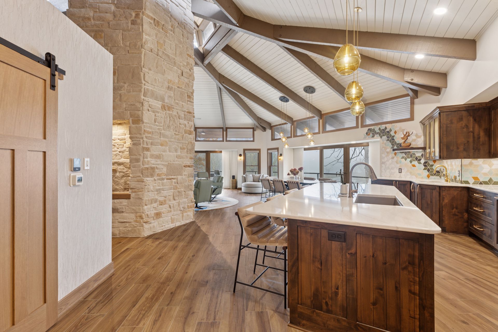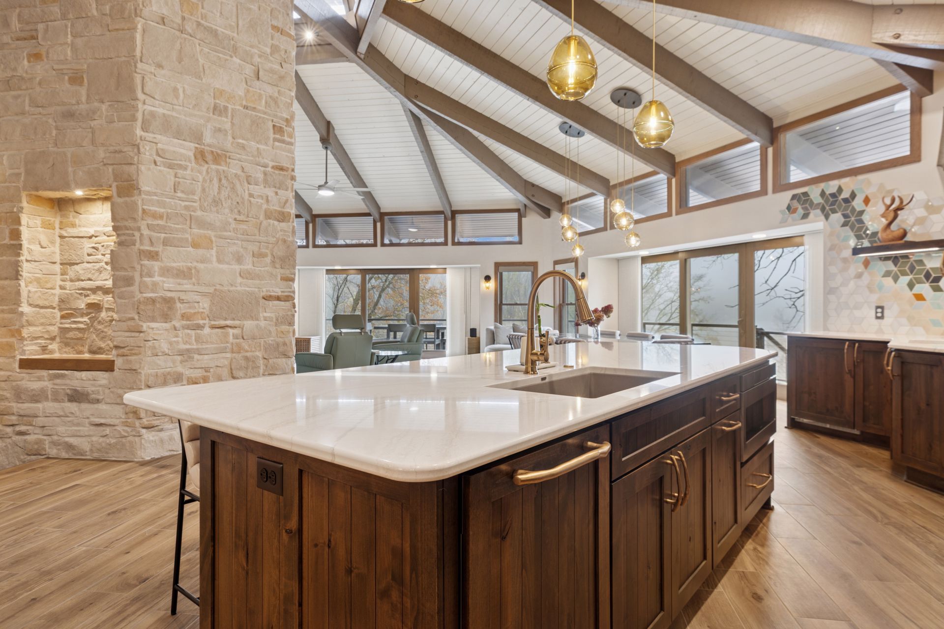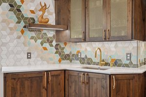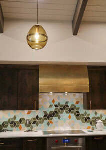 This hexagon house got a new lease on life. We literally took it down to the studs, and we connected the garage to the house by taking out the breezeway. The kitchen was moved to make it more spacious and suitable for cooking and hosting gatherings. The homeowner sought out unique and one of a kind finishes. The front door was specially made and shipped in. The tile backsplash was designed just for them and this space. We had so much fun with this project and bringing new life into this home.